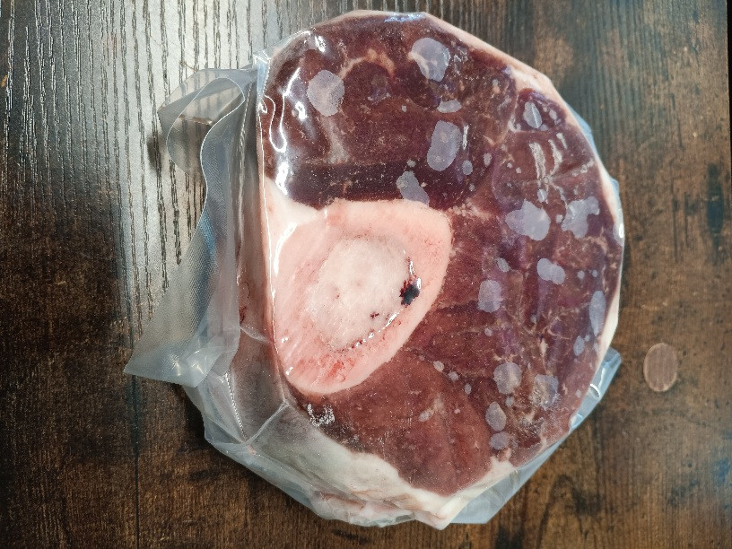 Cross-cut Beef Shank, or Rosso buck. In a braised dish you benefit from the extremely flavorful shank meat, but also the marrow in the center of the bone.